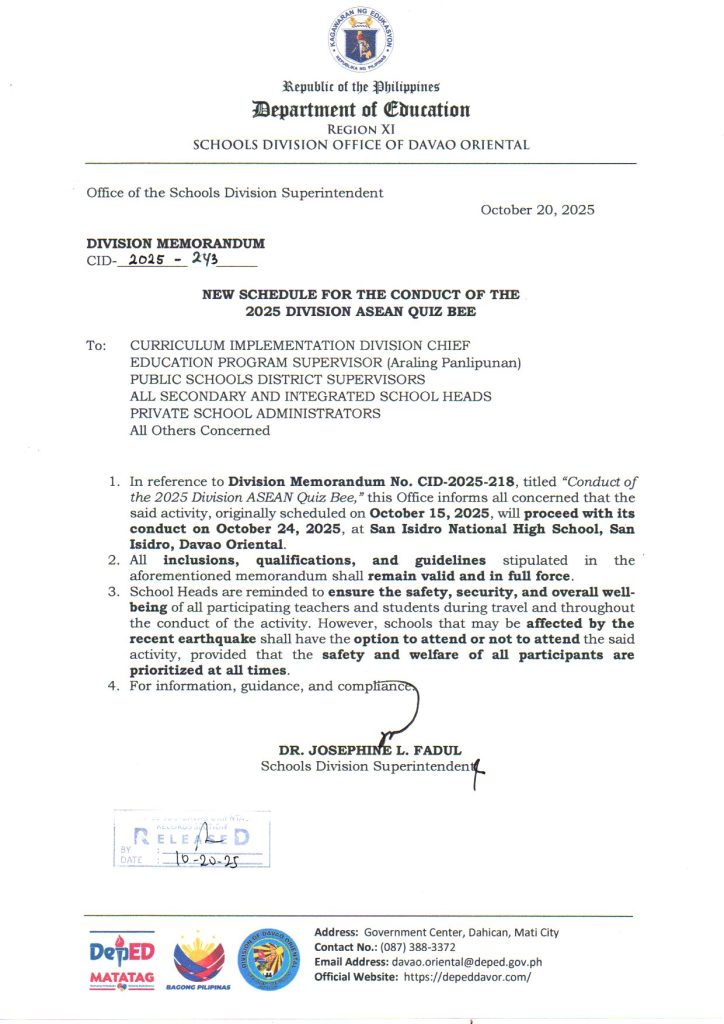 New Schedule for the Conduct of the 2025 Division ASEAN Quiz Bee