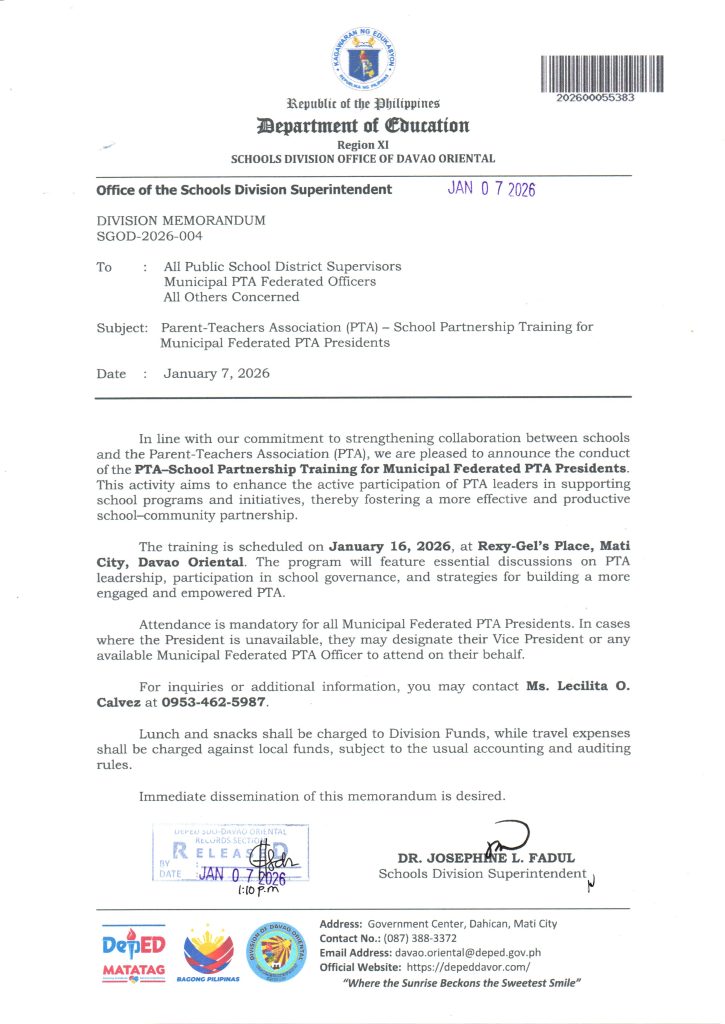 Parent-Teachers Association (PTA) – School Partnership Training for Municipal Federated PTA President