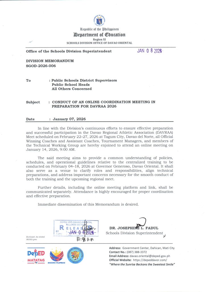 Conduct of an Online Coordination Meeting in preparation for DAVRAA 2026